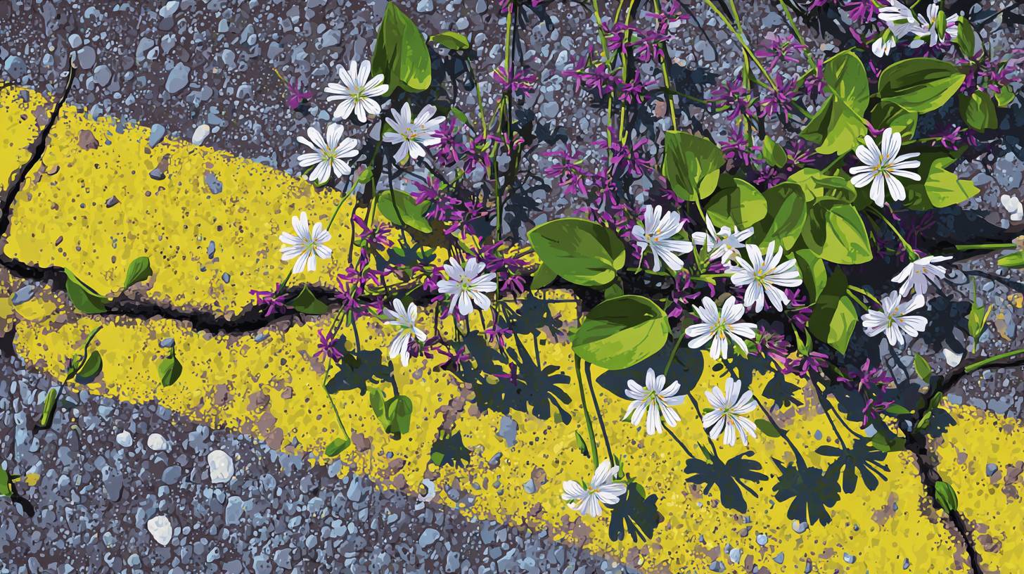 Standing in the aisle of little sweet nothings under bright lights, fingers carefully flipping through colors and cartoons like an elder checking for cracks in a paper carton of fresh eggs, as if breakage feels inevitable, as if what love remains gathers in the dark folds of a greeting card, the husband exits, empty-handed, weary of ways to express tenderness, when at his feet, through asphalt seams, starry petals of chickweed glimmer and purple bells of henbit ring— apologetic, humble, alive, vying for his attention, if only he noticed love blooming through cracks.